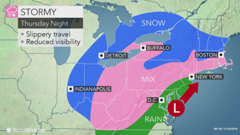 A winter storm that threatens snow, ice, and rain along the way will carve a path form the Gulf of Mexico to southeastern Canada starting Wednesday night Nov. 14 and running through Friday Nov. 16, according to AccuWeather.