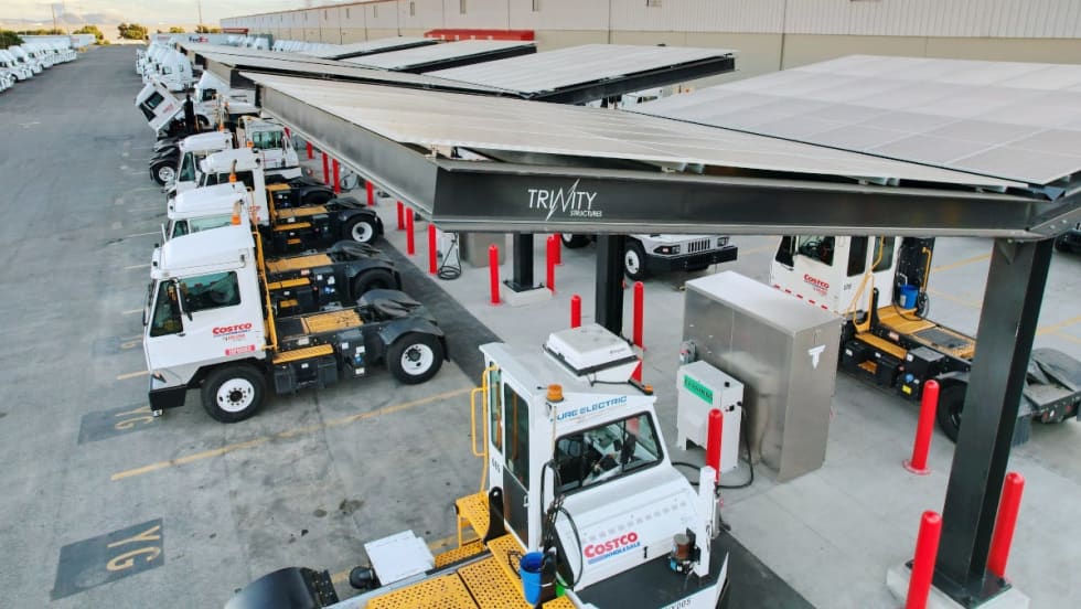 Costco is charging battery-electric yard tractors with off-grid electrified structures at its distribution center in Mira Loma, California. The integrated charging system by Trinity Structures was completed and in operation in just four months.