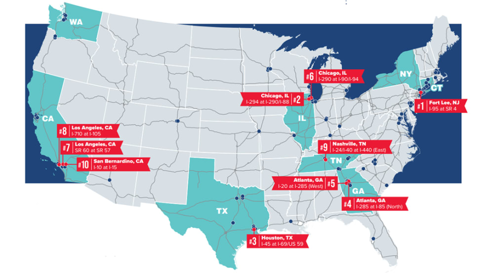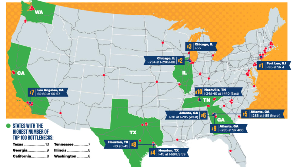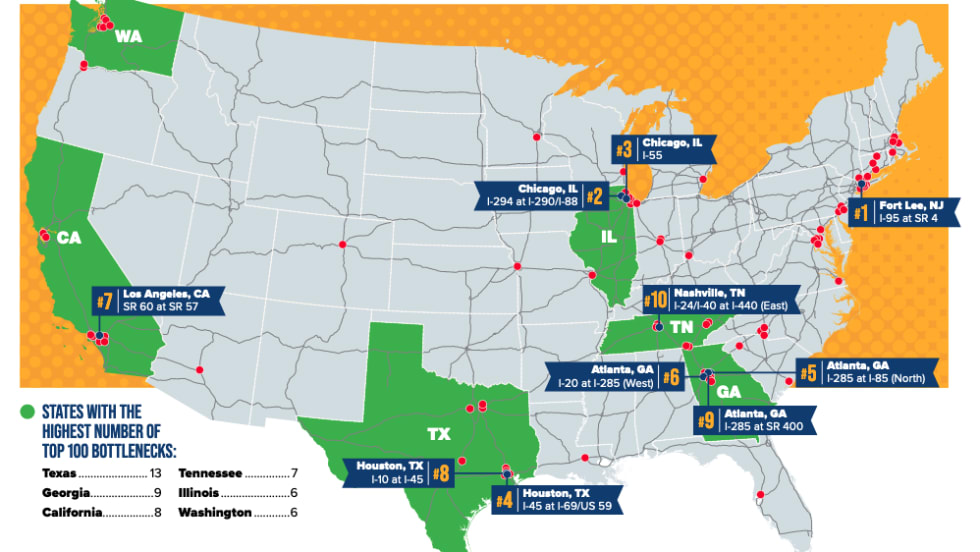 The American Transportation Research Institute's 13th annual list highlighting the most congested bottlenecks for trucks in America identified the 100 worst offenders, with Georgia, Texas and Illinois having more than one on the top-10 list.